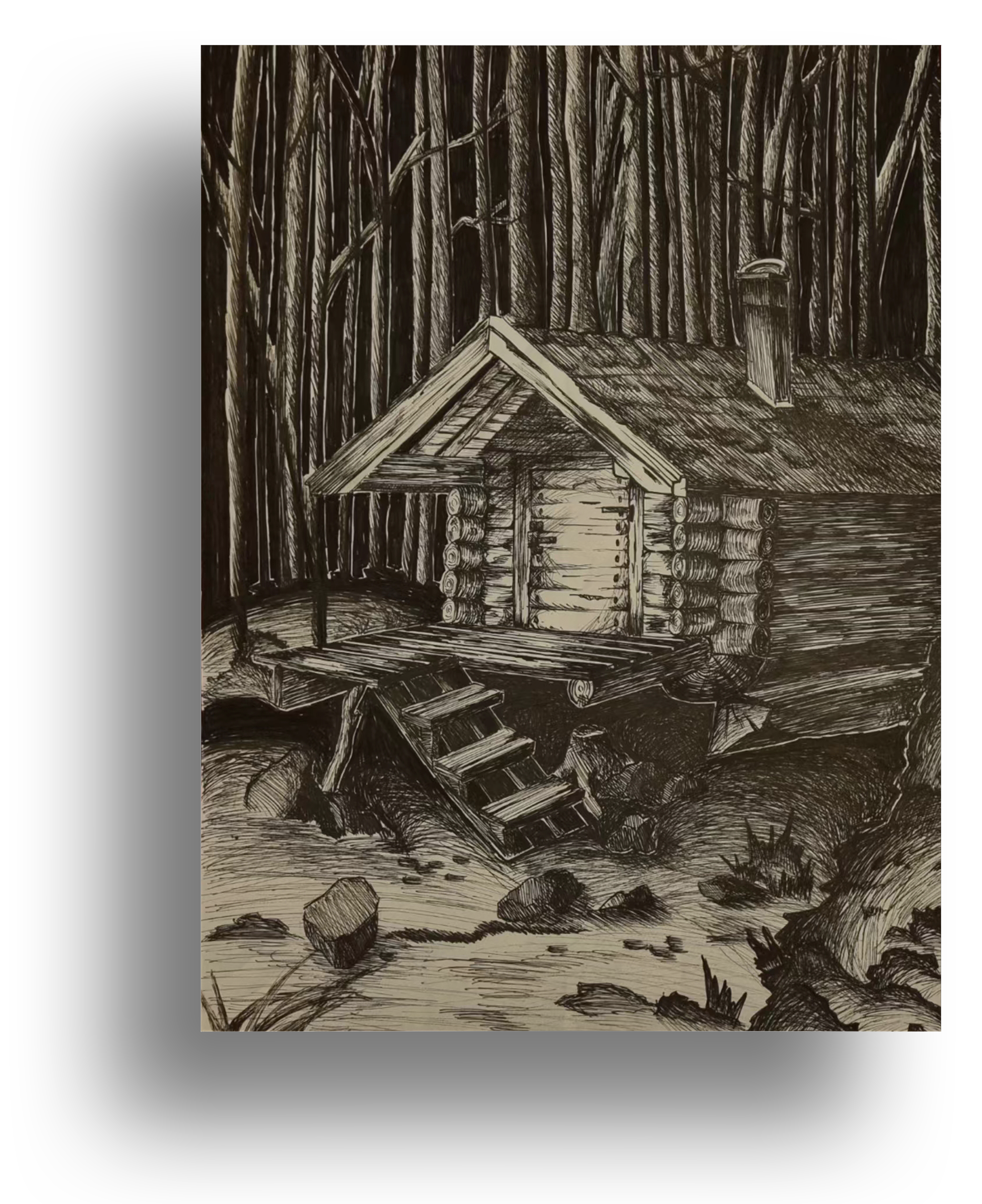 I designed the composition to guide the viewer’s eye from the uneven, detailed foreground to the cabin’s sharp structure, creating a focal point. The towering trees in the background add a sense of isolation and mystery. This piece explores how lines and shading can create realistic, dramatic scenes and convey a moody atmosphere.